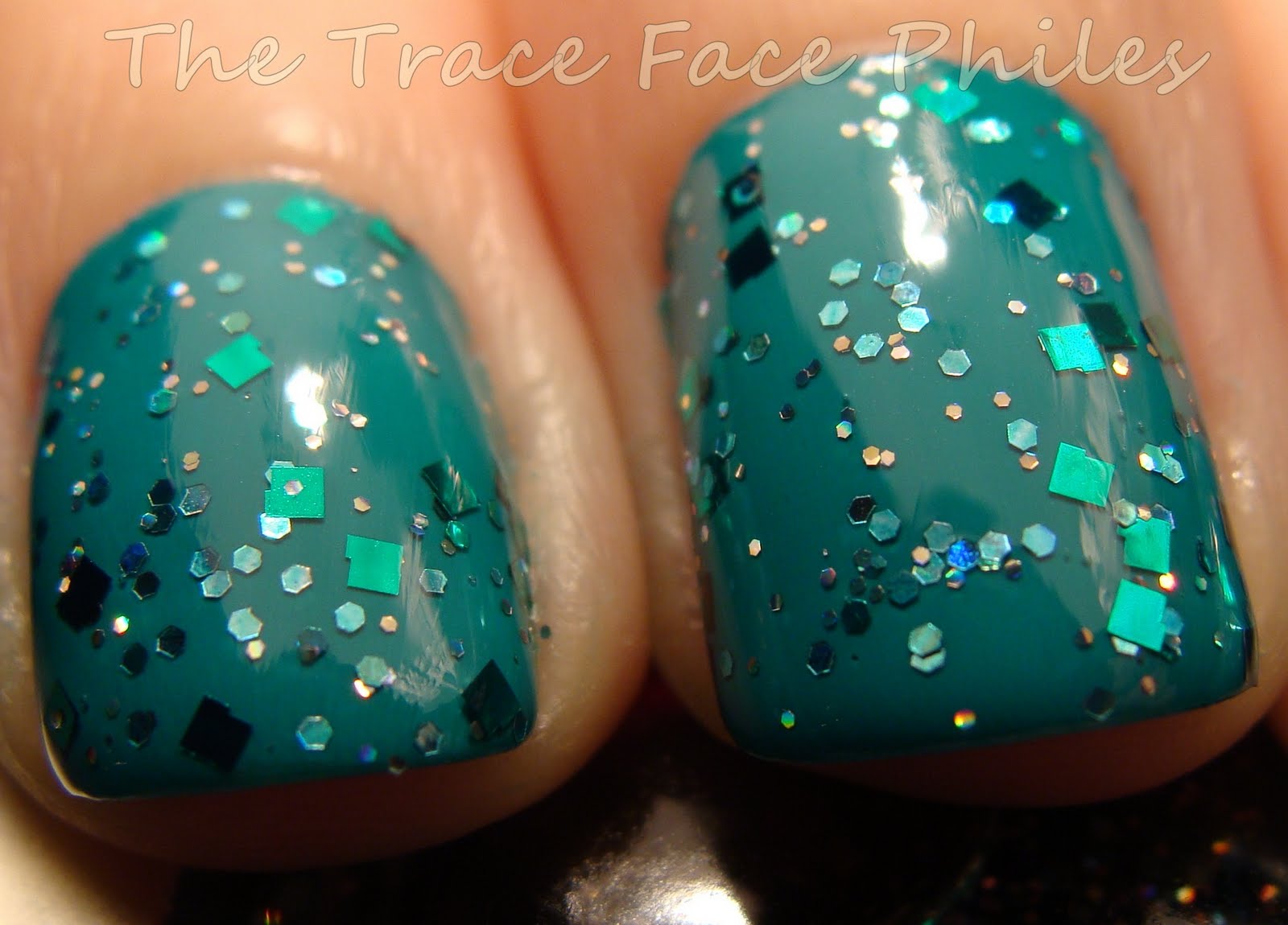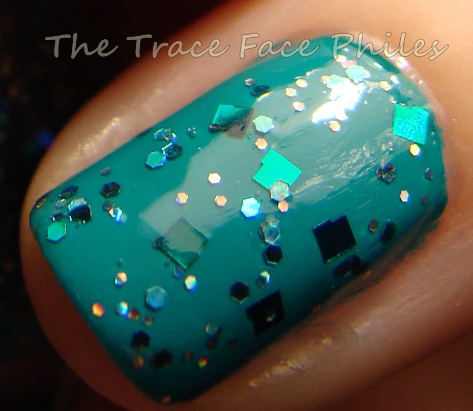 Edward is the glitter topper of the set. I was surprised how thick this polish applied. It is packed with two different sizes of glitter in square and hexagon shapes. The colors of the glitter are green, blue and holographic. I only needed one coat of this to look even and well covered. I applied a layer of Gelous before adding Orly Sec N' Dry top coat.