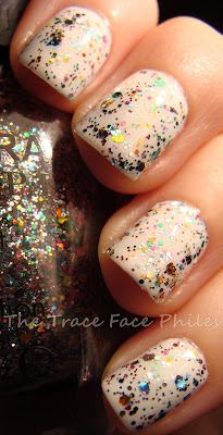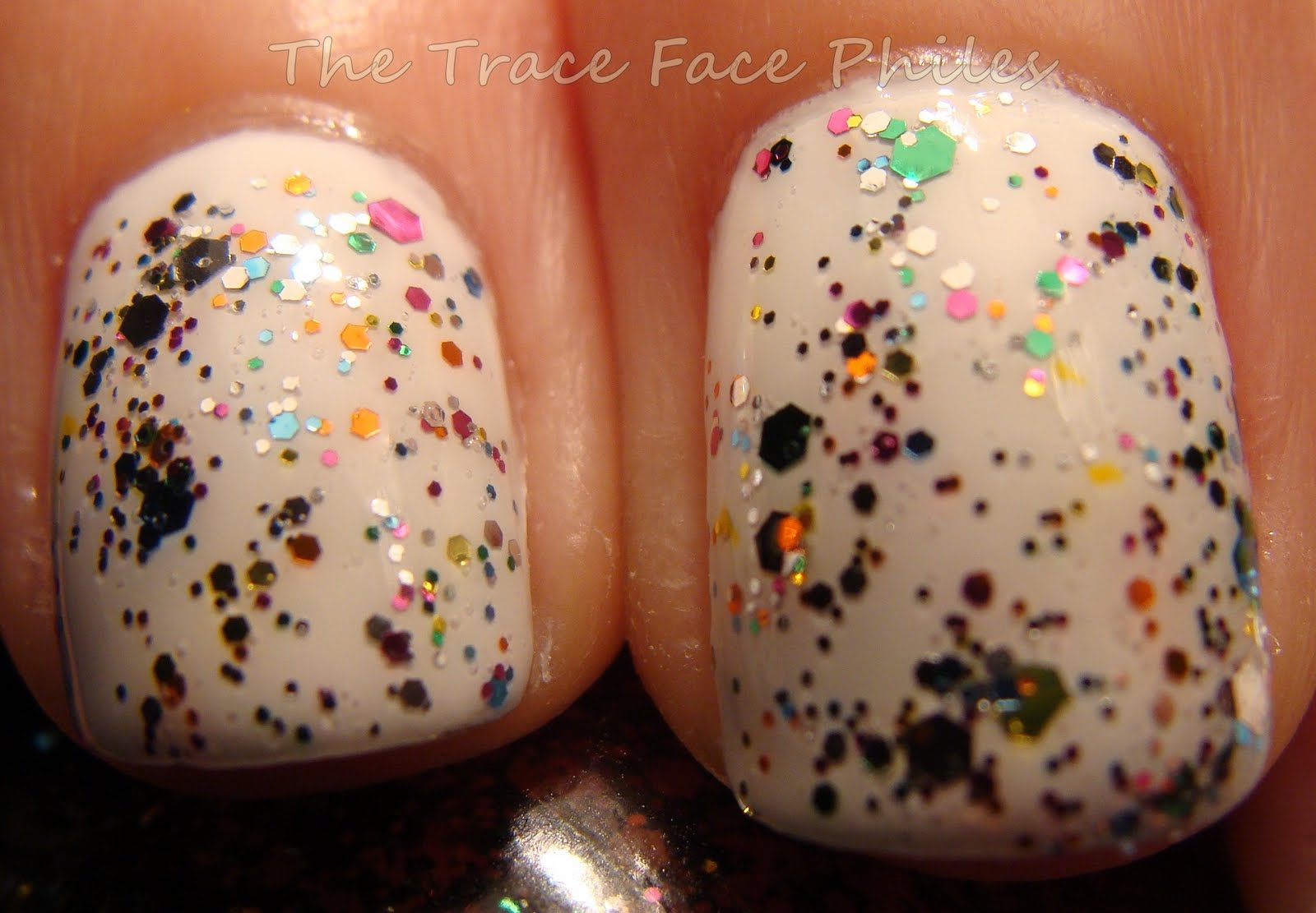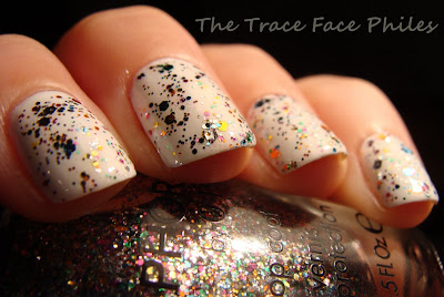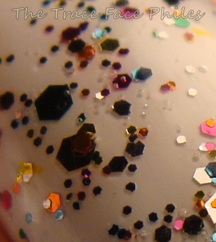 Spark-tacular top coat is a multi-colored glitter polish in a clear base. This polish is PACKED with glitter! One coat is all you need! It looks like it has 3 different sized hexagon shaped glitters. There are so many colors too, I cannot even begin to name them all! I decided to layer it over white to make it POP!