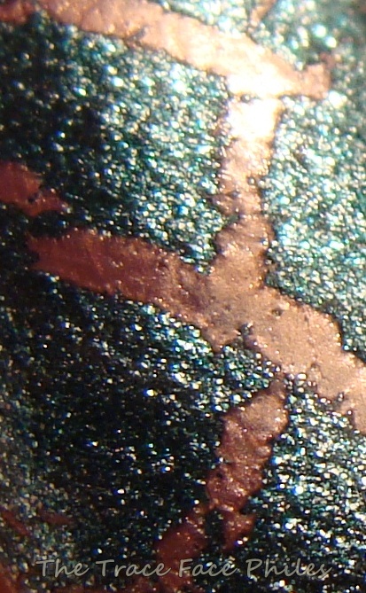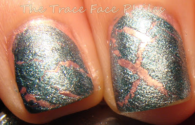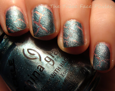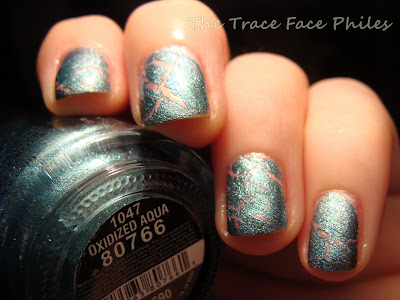 I then added Oxidized Aqua. I applied diagonal brush strokes for a different effect. I ended up with what I would consider a "Crackle Fail". Not sure what went wrong, I am thinking my coats weren't thick enough. I have never had a problem with OPI or China Glaze Shatter/Crackle before. I do like the contrast between these two colors though!