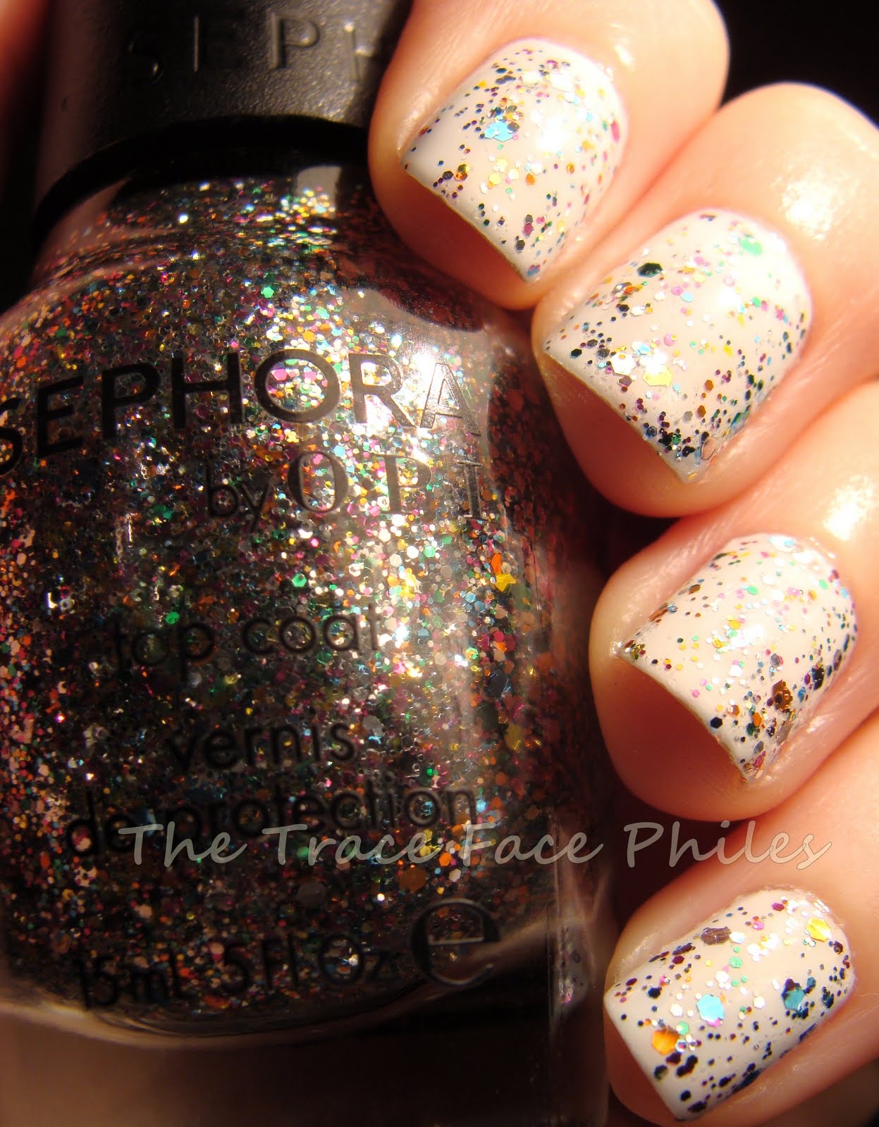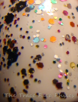Spark-tacular top coat is a multi-colored glitter polish in a clear base. This polish is PACKED with glitter! One coat is all you need! It looks like it has 3 different sized hexagon shaped glitters. There are so many colors too, I cannot even begin to name them all! I decided to layer it over white to make it POP!